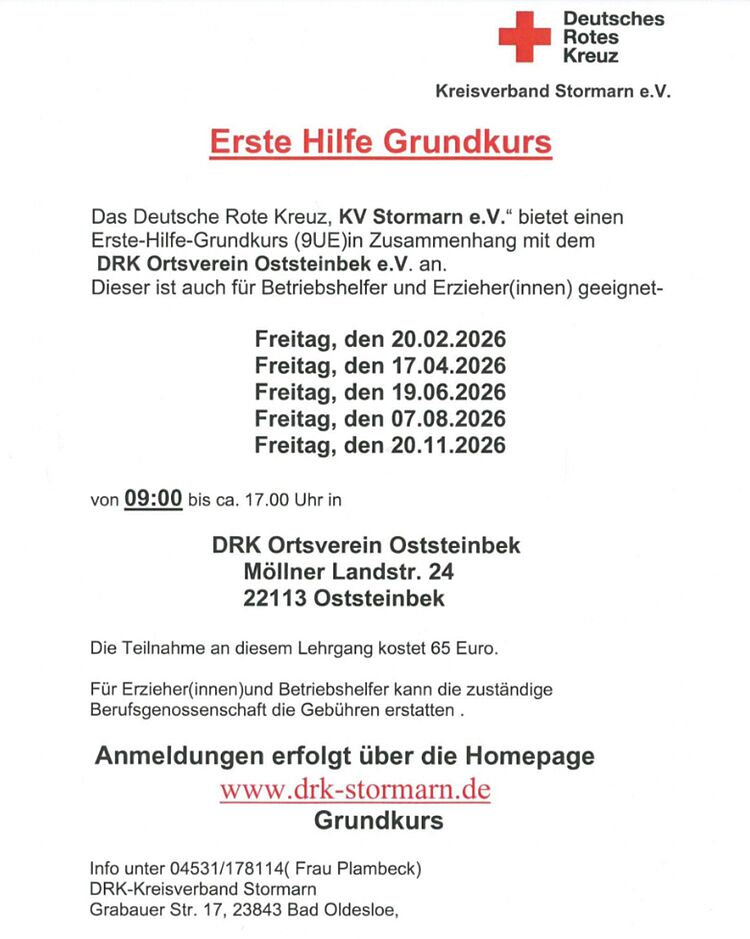 Der DRK Ortsverein Oststeinbek besteht seit 40 Jahren, zur Zeit mit 271 Mitgliedern.